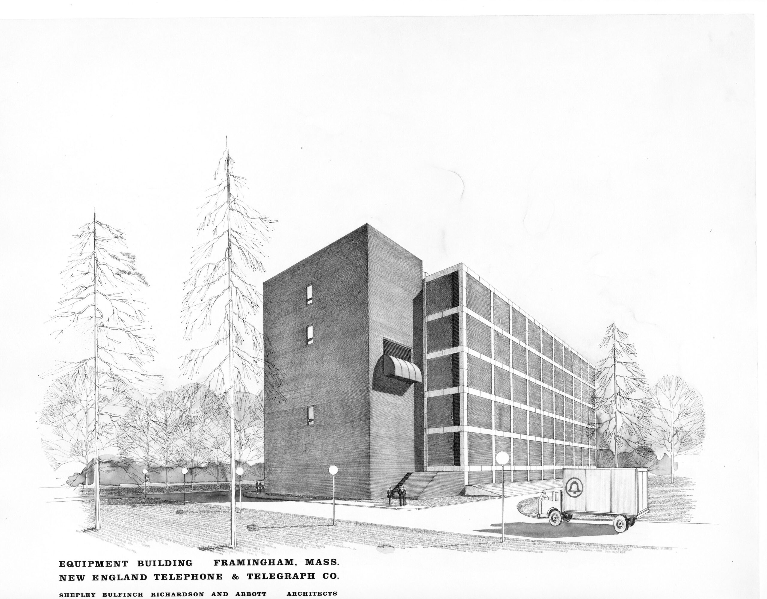 In 1941, Shepley Bulfinch Richardson and Abbott designed the Brookline Courthouse. The building, designed in a late Colonial Revival style, features a red brick facade and a wooden cupola inspired by Harvard Hall in Cambridge. The front of the courthouse is marked by three monumental arches, drawing inspiration from Charles Bulfinch’s Lancaster Meetinghouse.
