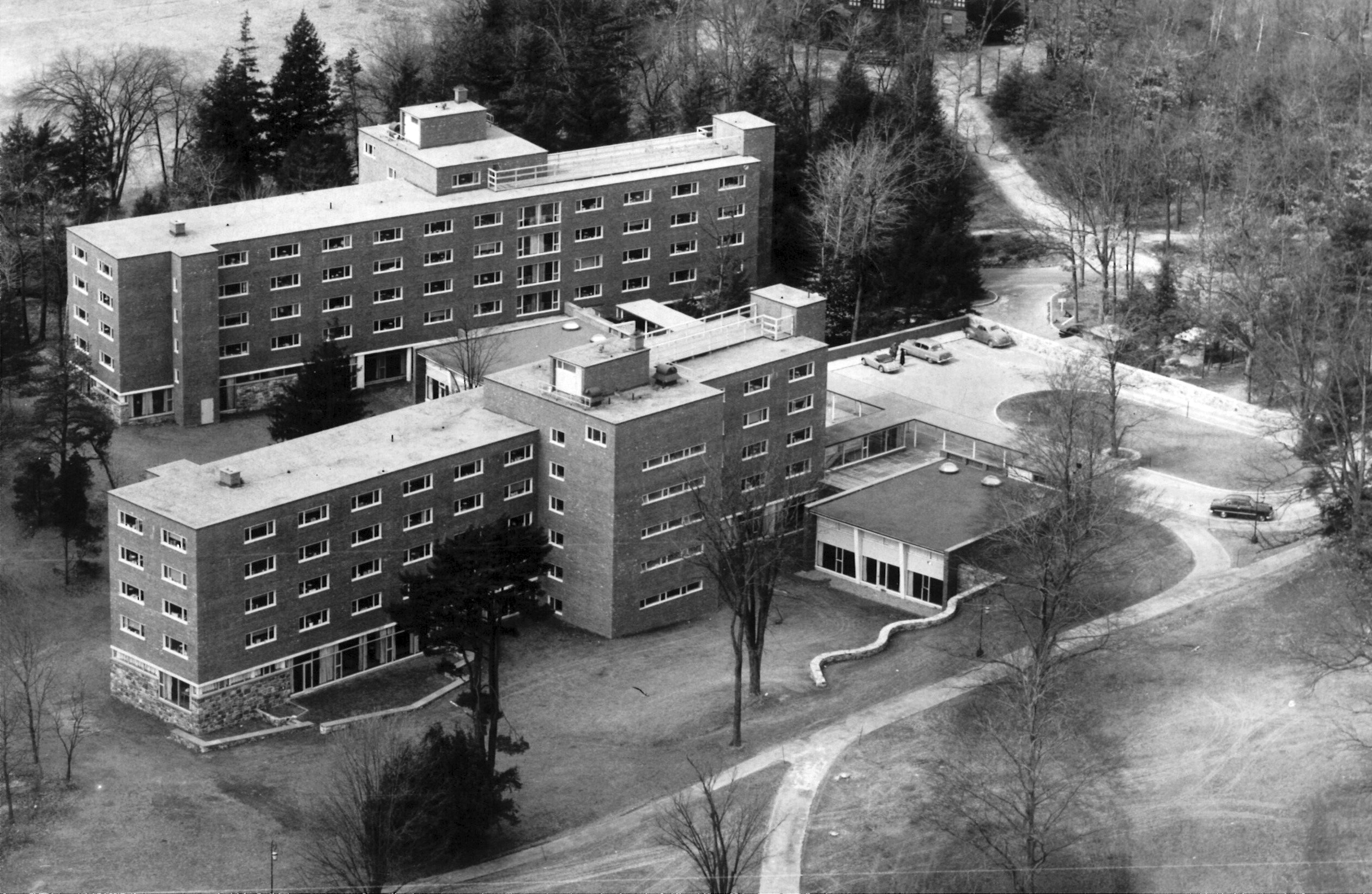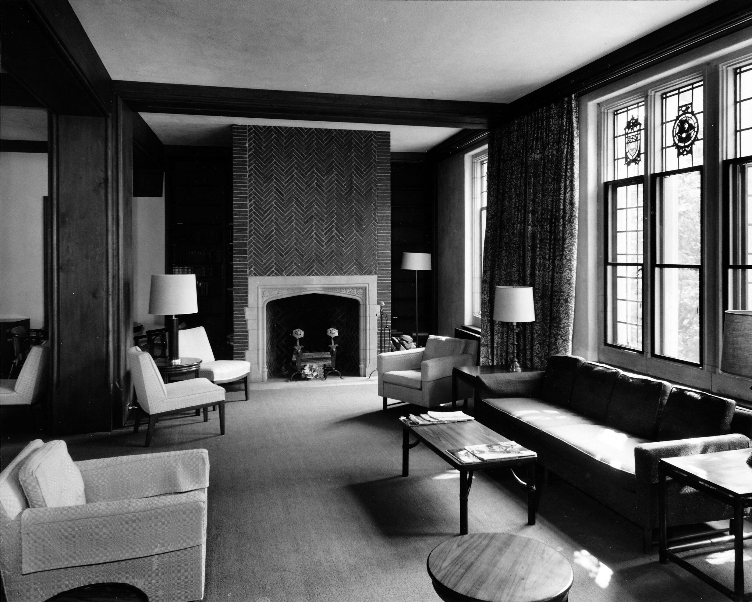 Designed in 1961 by Shepley Bulfinch Richardson and Abbott, McAfee Hall expands Wellesley’s growing residential community. All three dormitories are physically interconnected, creating a cohesive residential complex. McAfee Hall follows a similar modernist style – emphasizing clean lines, functional layouts, and simplicity – while fostering student connection. While the building appears to be a wholly mid-century modern design from the outside, the interiors embrace more traditional looks, including a living room designed around a fifteenth century French Gothic stone mantel and an Austrian Gothic ceiling.