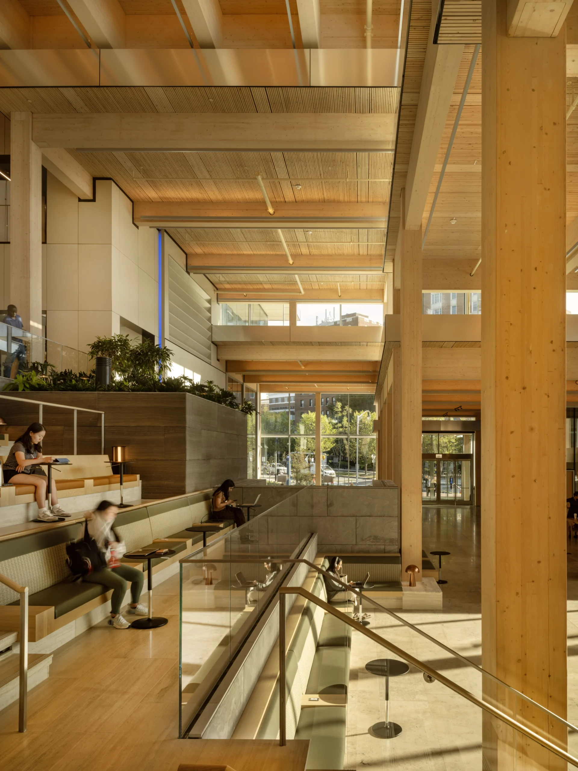 One of the most significant sustainability moves in the project is its hybrid concrete and mass timber structural system. Above a concrete base, the building transitions to mass timber framing and roof decking. This approach delivers multiple environmental benefits: lower embodied carbon than a traditional all‑steel structure, long‑term carbon storage in the wood itself, and smarter use of materials: wood where it shines, concrete where it is needed most.